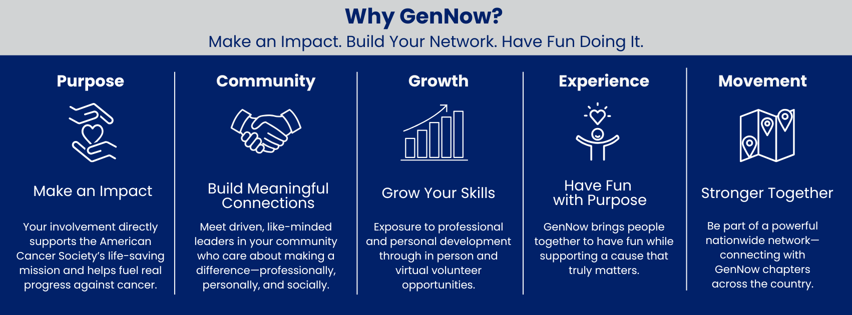 We are so proud of the work we have made possible in the Long Island community. Our GenNow Network Long Island chapter is made up of members who are all support the American Cancer Society’s vision to end cancer as we know it, for everyone.